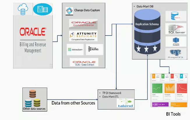 The Replica Database receives data from the Pricing and Billing system. Data replication tools capture changes from the source system and apply them to the Replica Database.