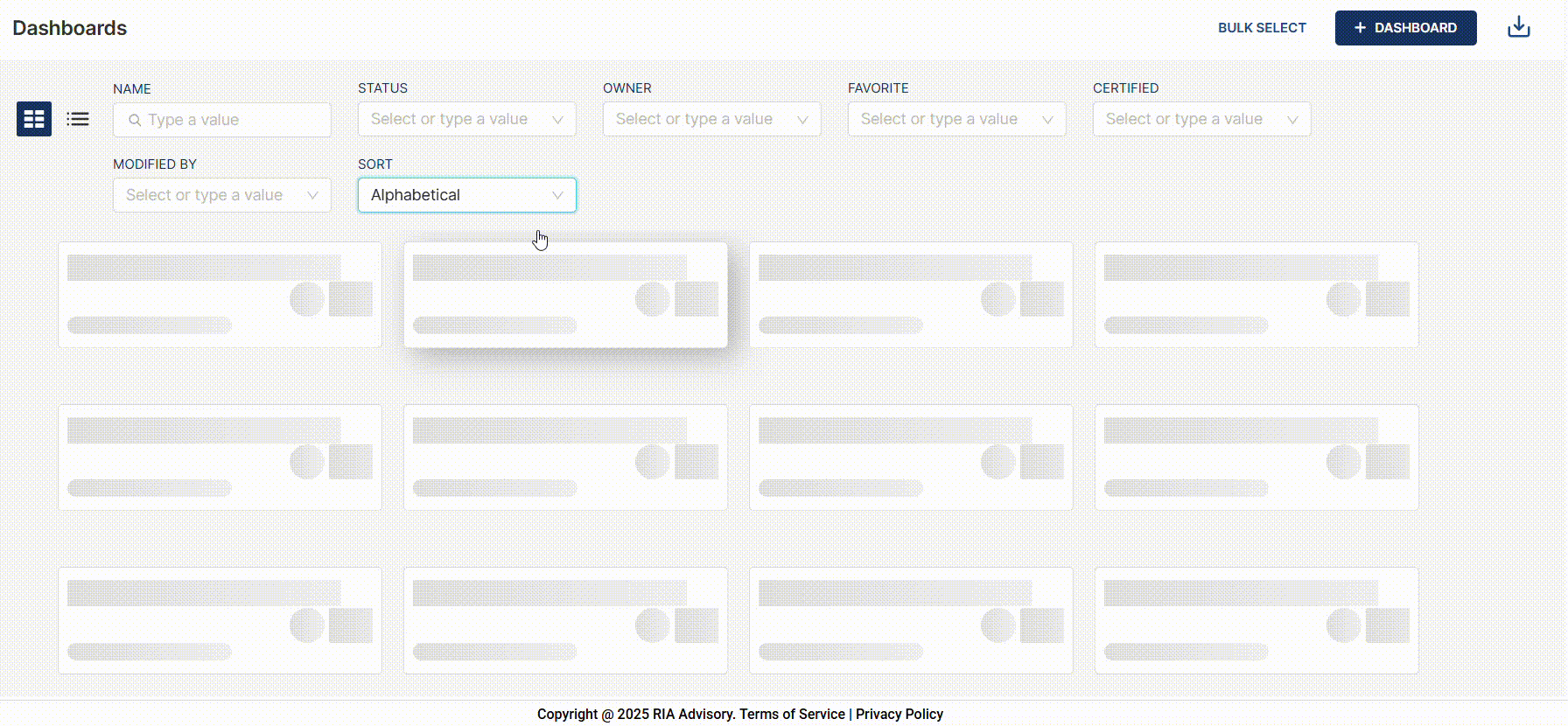 To sort dashboards in a card view, select the sorting order in the SORT dropdown field.