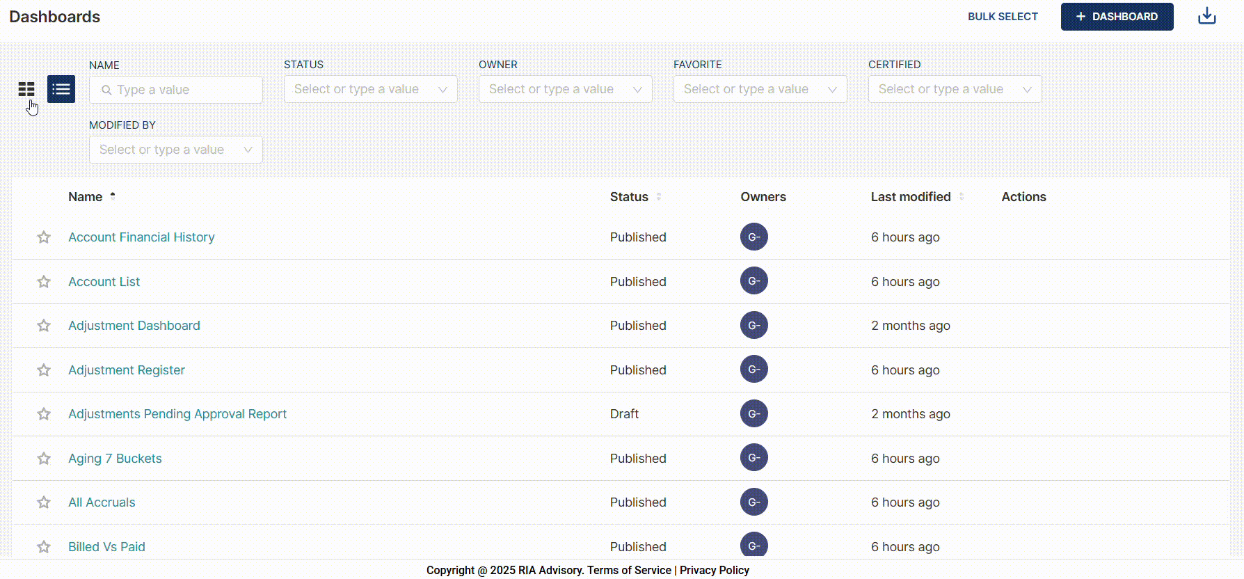 To switch from list view to card view, click the card view icon located in the upper left corner of the page. The cards display the same information as the dashboards in the list view, except for the Owners.