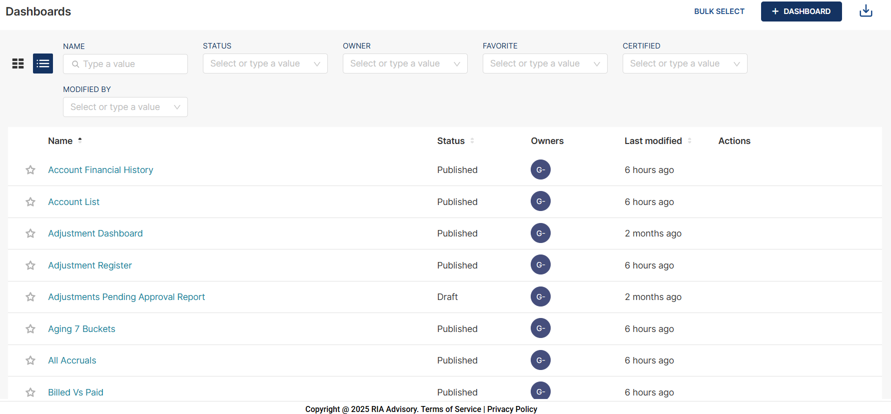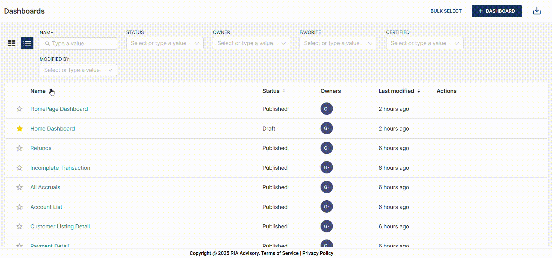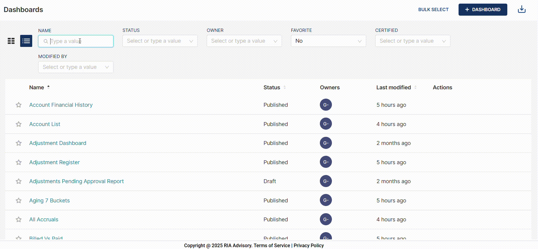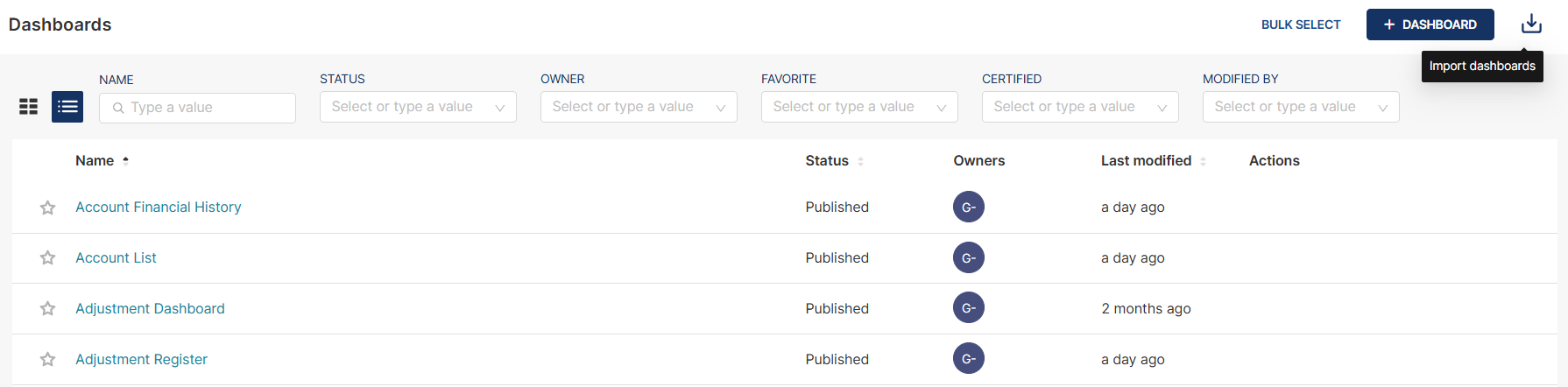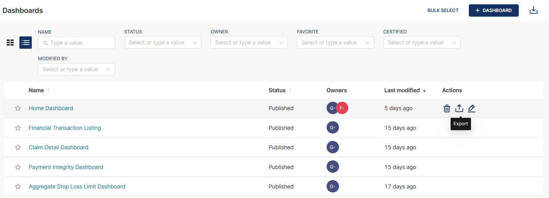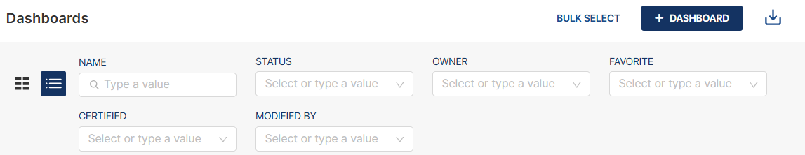 To filter the list of dashboards in card or list view, you can enter valid values or select a value from the list in the parameters on the headers. You can use one or more parameters for your filter.