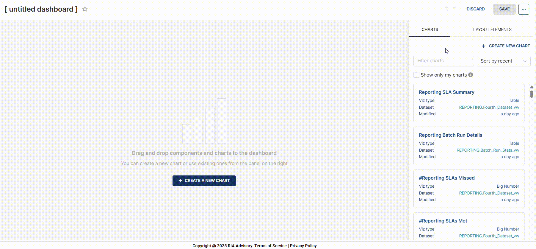 - In the CHARTS tab, drag the charts you need to add to your dashboard.
