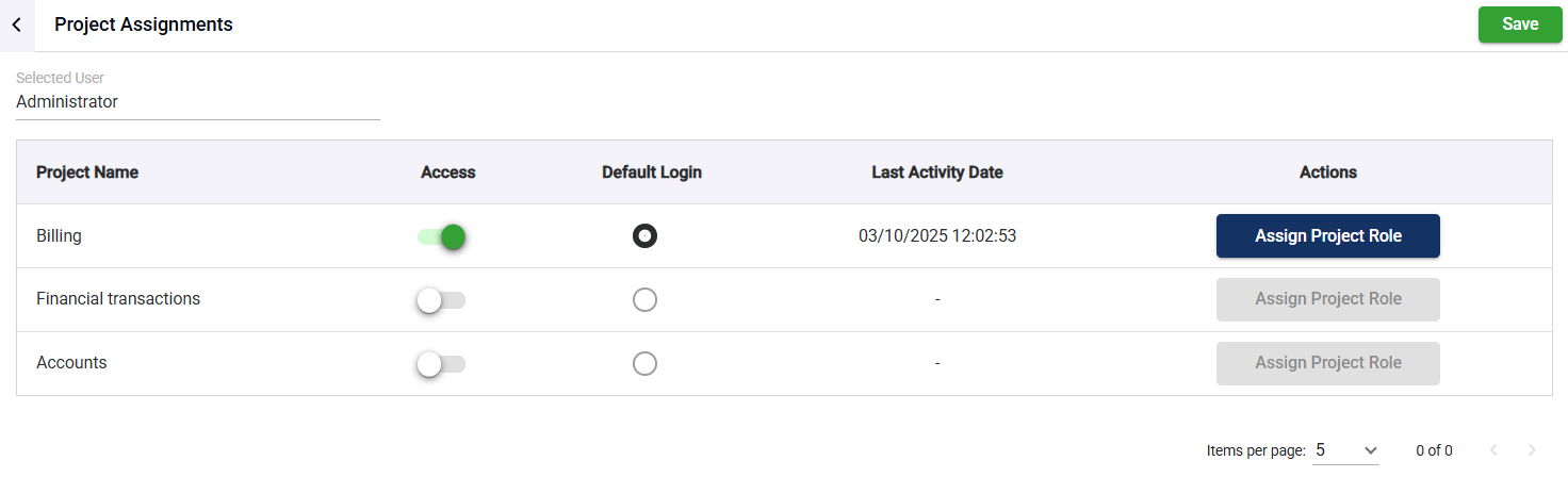 The Project Assignments module is where user access and roles across multiple projects in the system are managed. In this page, administrators can grant or revoke access to specific projects, assign user roles, and define which project will serve as the user’s default login environment.