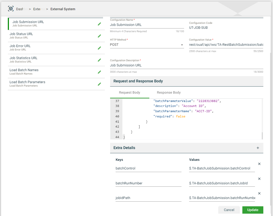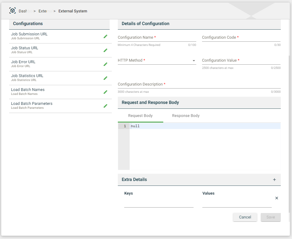 | Extra Details | Defines additional details for the batch configuration in key-value pairs format. |