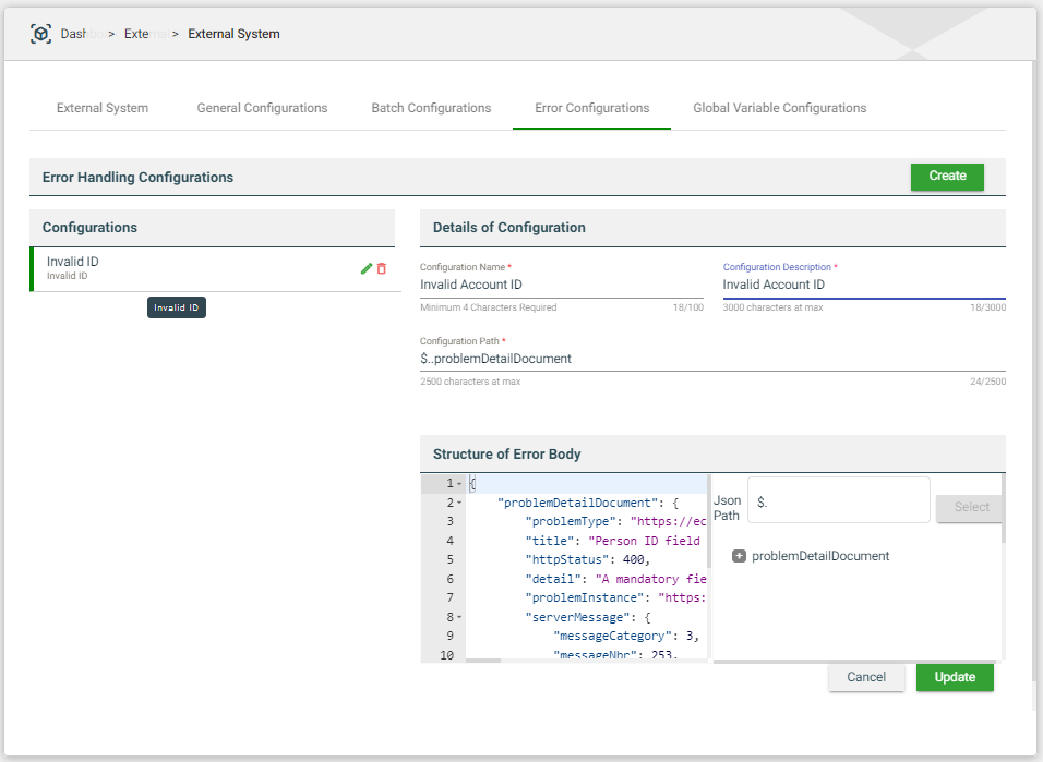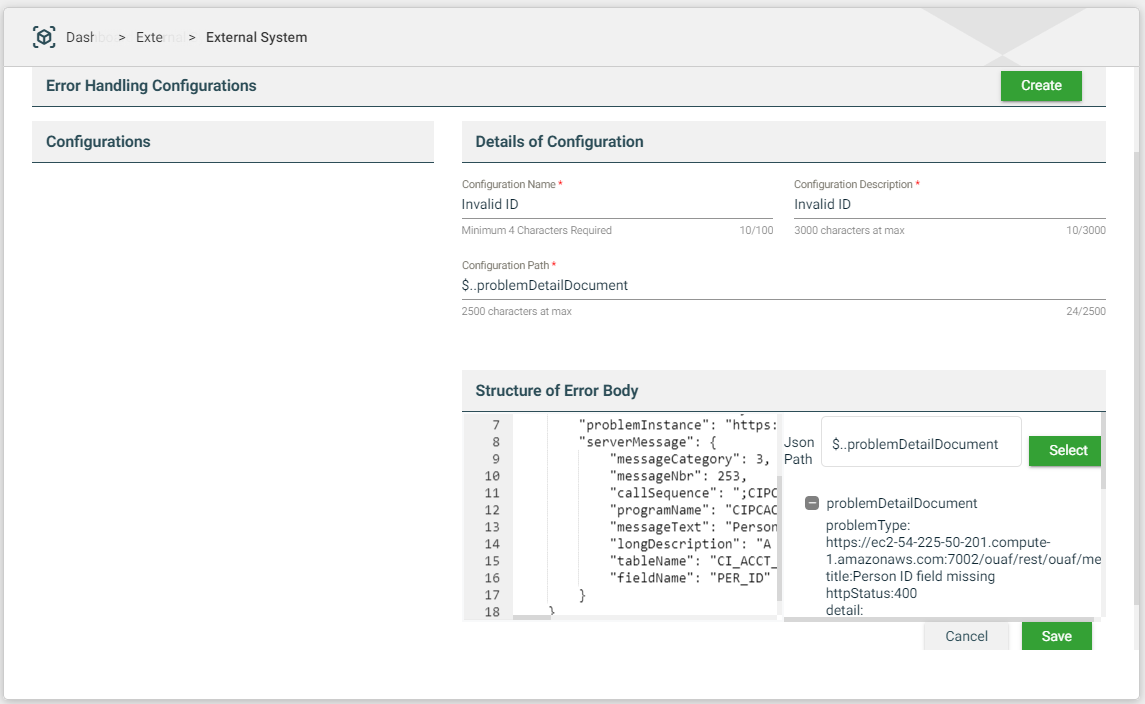 Automatically gets the value of the JSON Path textbox in the Structure of Error Body configuration, when Select is clicked. Mandatory: Yes |