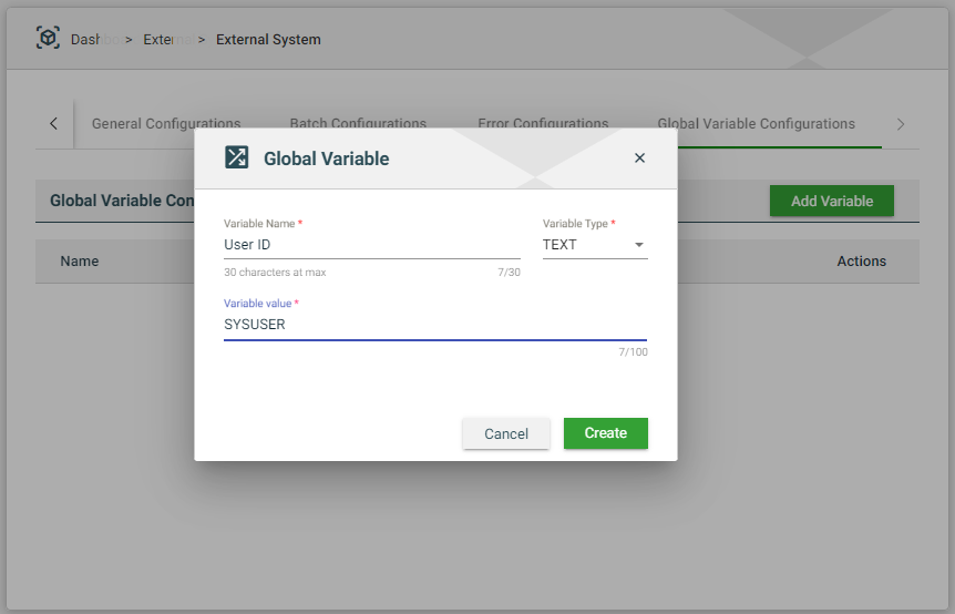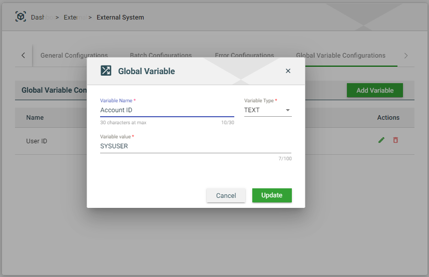 The variable configured in the Global Variable Configurations module can be used across the external systems. Global variables are used to hide actual values. A global variable will be displayed instead of its table actual parameter value. For example, you can set a global variable for your username and password so that their actual values will not be displayed on test execution and results.