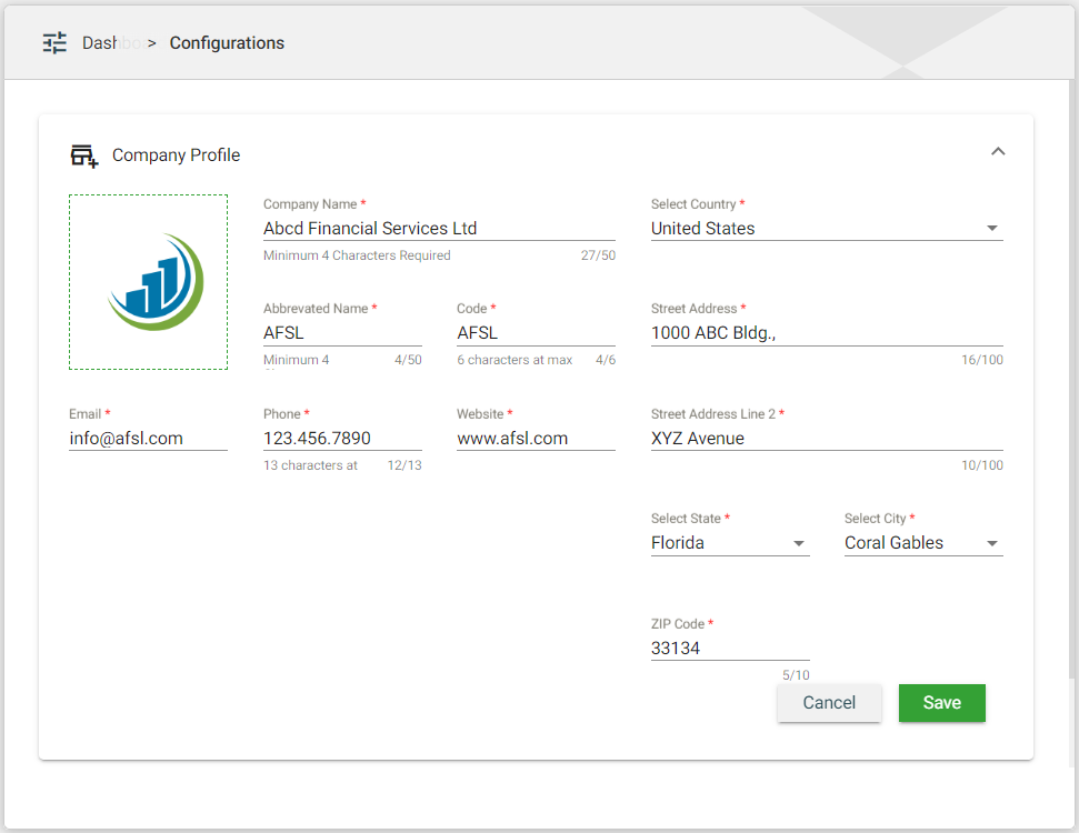 The Company Profile is a dedicated submodule where you can provide detailed information about your company, including its name and logo. You can also include your contact details such as email address, phone number, and website URL. Additionally, you can provide your company’s physical location information, such as the street address, city, state, and zip code, to help customers find you in person.