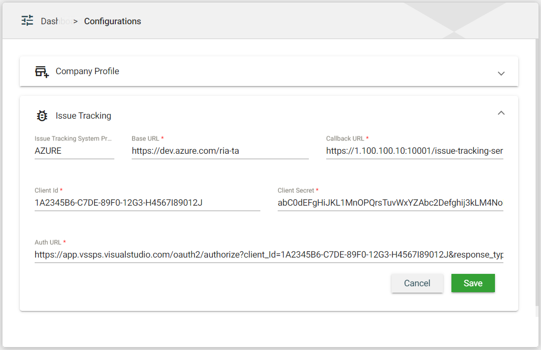 The Issue Tracking configuration allows you to configure your issue-tracking application in either JIRA or AZURE.
