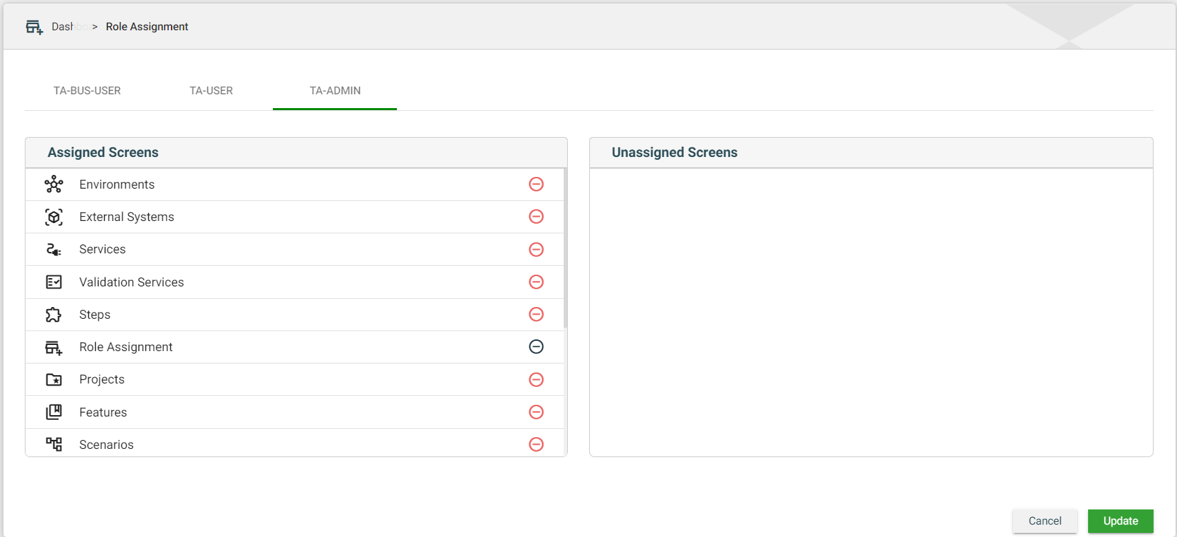 on the Assigned Screens list. You can remove any assigned screens, except the Role Assignments screen, from the TA-ADMIN user.