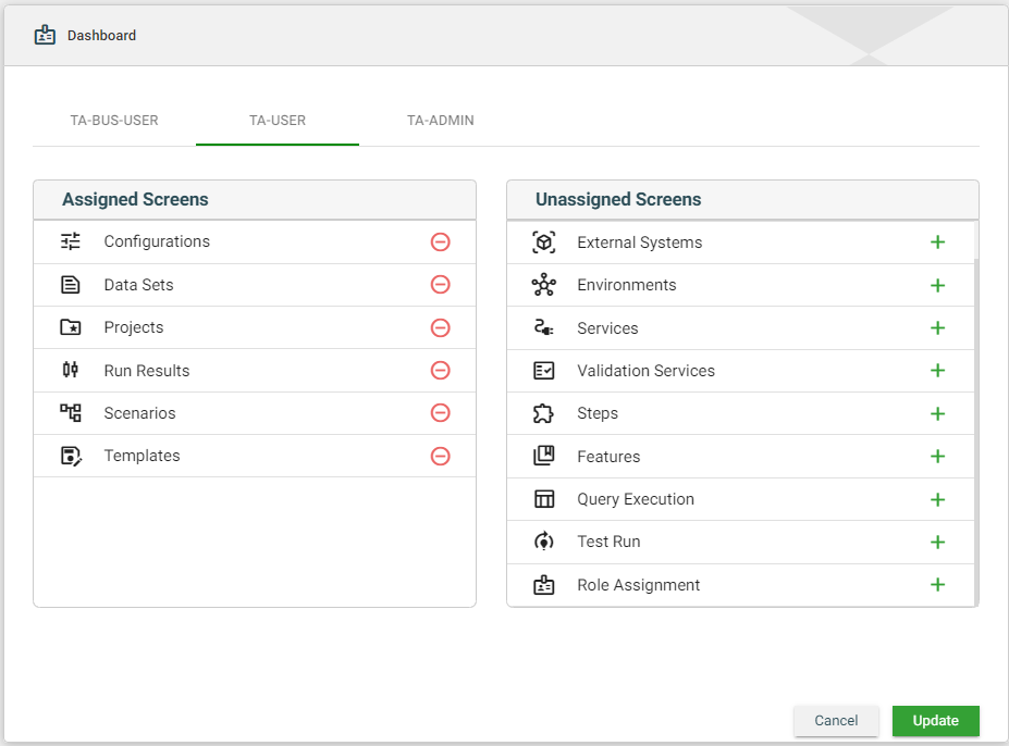 TA-USER— By default, a user has access to the Projects, Data Sets, Scenarios, Run Results, Templates, and Configurations modules.