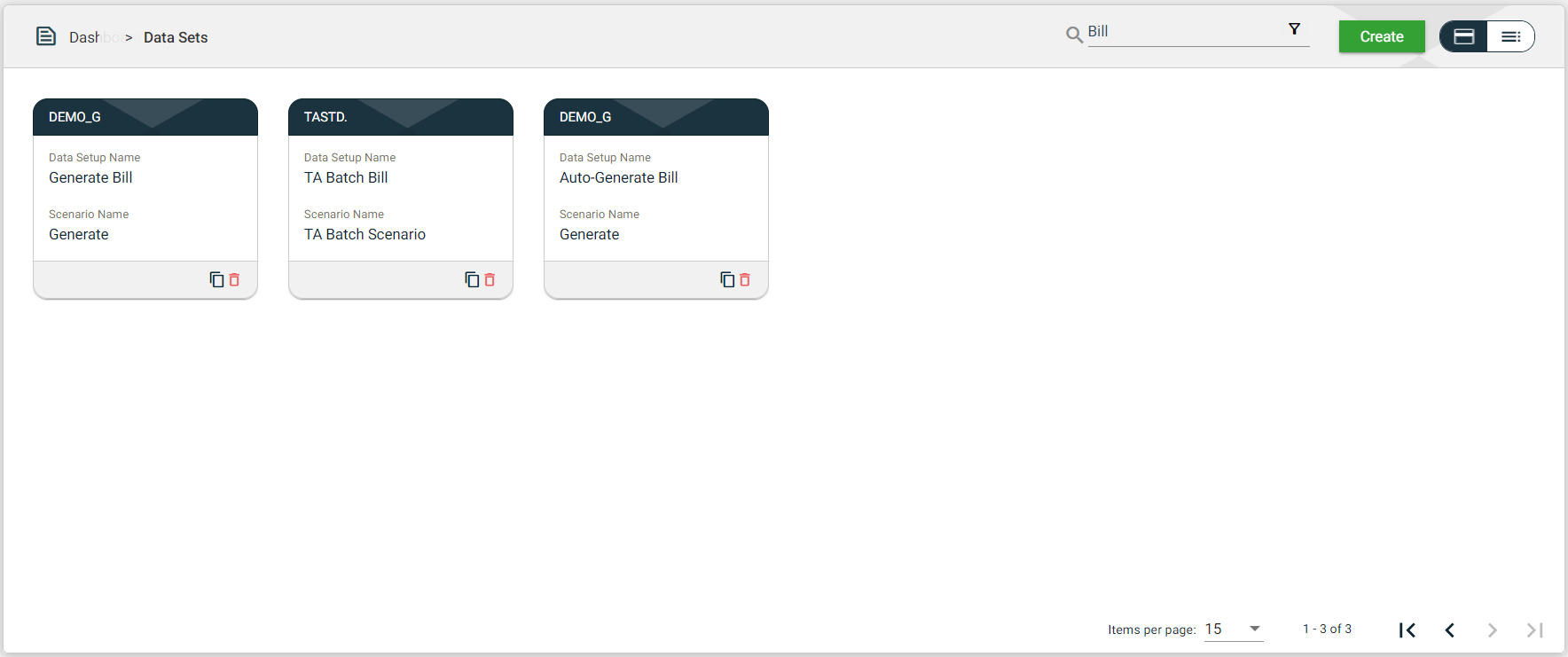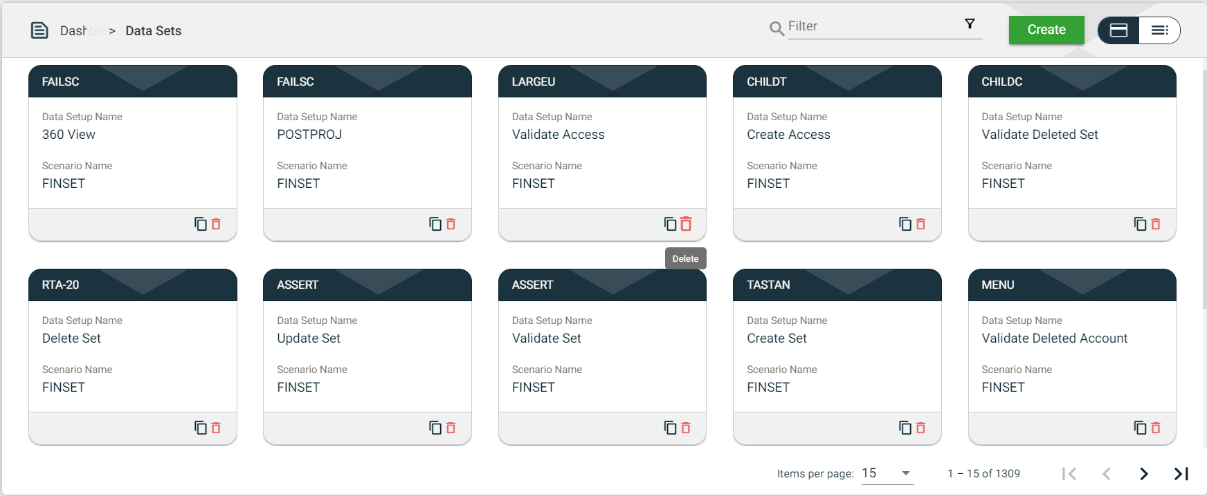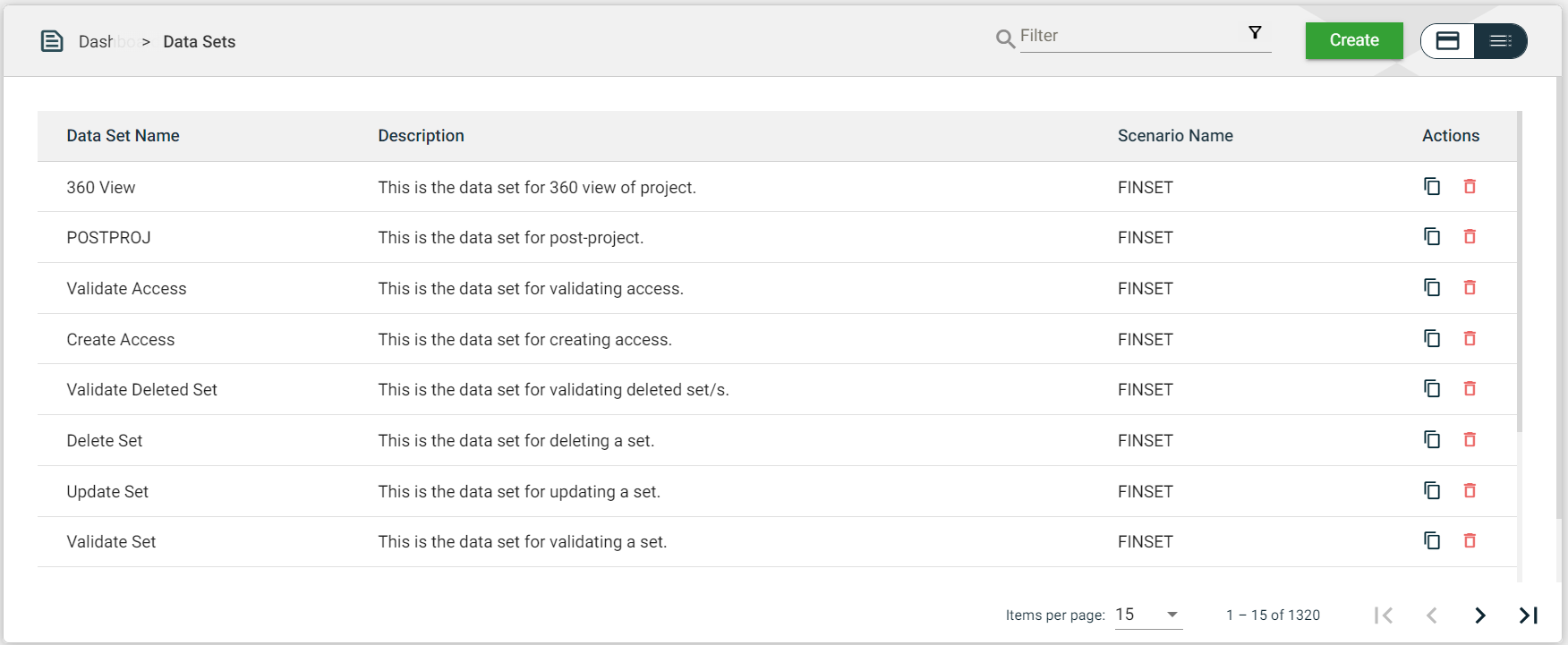 The Data Sets module allows you to manage your test data, including viewing available datasets, creating new ones from templates or queries, and cloning existing datasets.