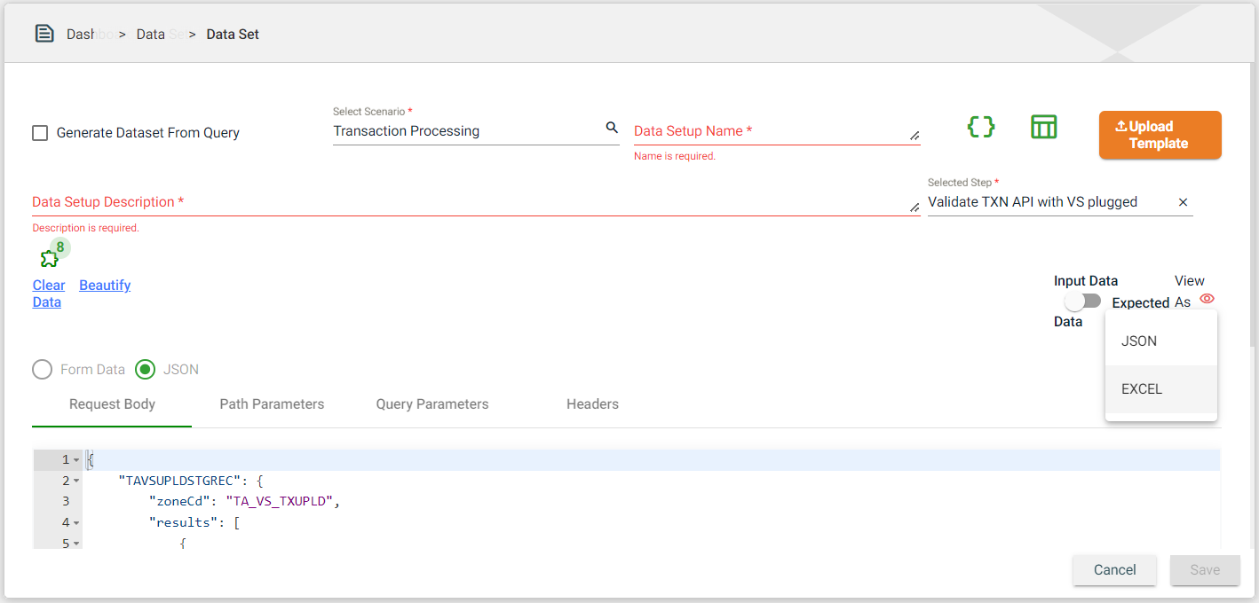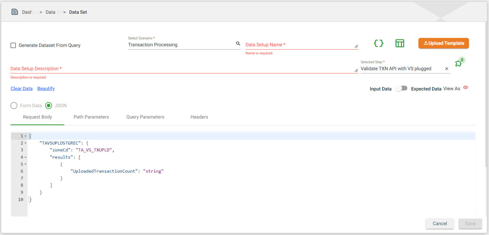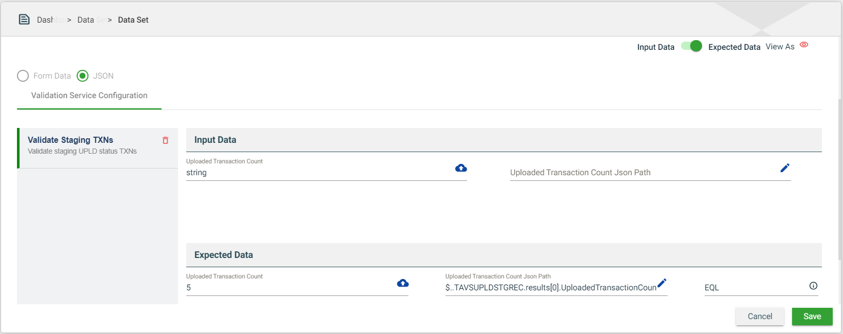 If a validation service is added to the steps associated with the selected scenario in Step 1, toggle to Expected Data.