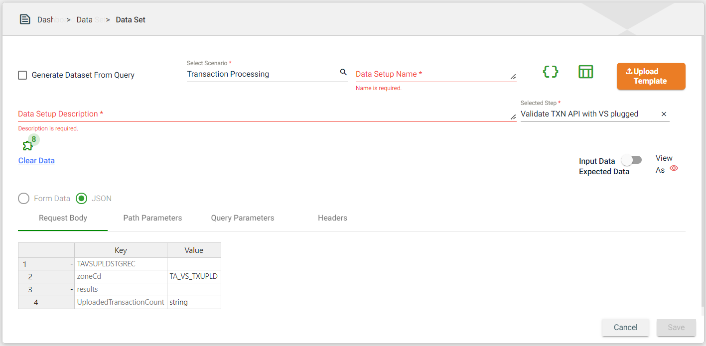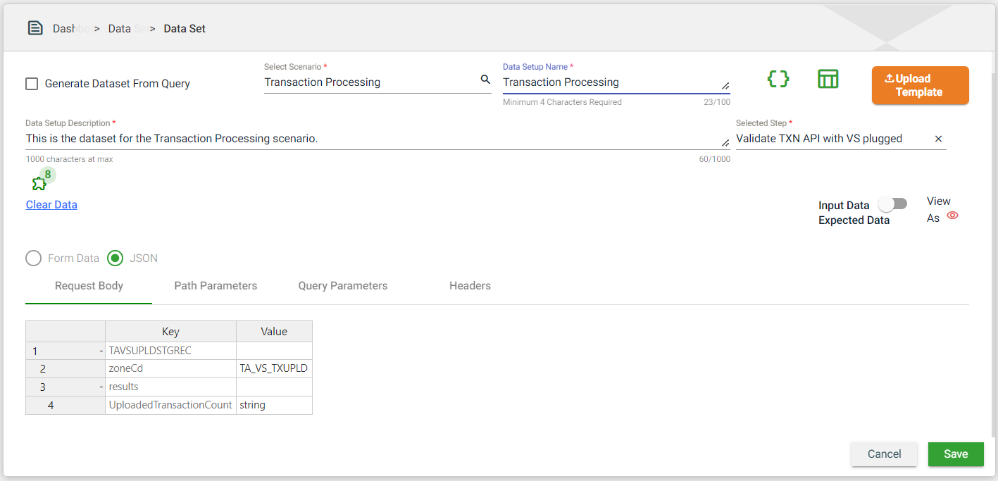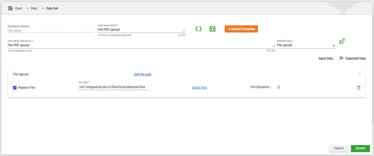 Upload the edited template. Verify if the test data is correct for all parameters configured with test data. \