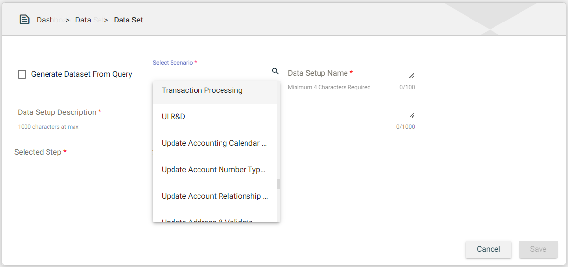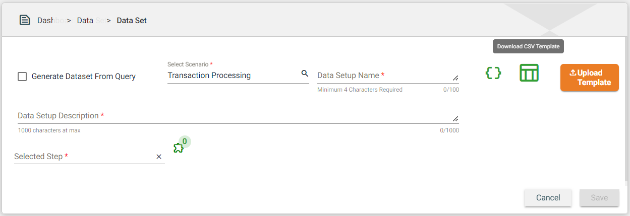 This creates a dataset using the compiled templates of all steps associated with the selected scenario. To create a dataset from a template, follow these steps: