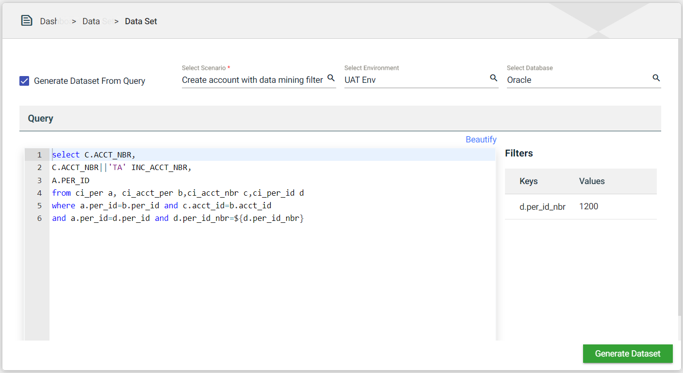 This creates a dataset using the compiled templates of all steps associated with the selected scenario. To create a dataset from a database, follow these steps: