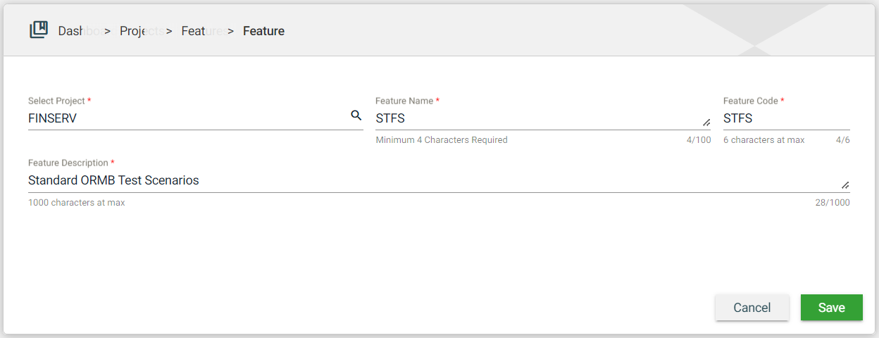 | Select Project | Name of the project that will use the feature. When creating a feature from a project, this field is automatically populated with the initially selected project. Otherwise, a dropdown list of all available projects is displayed.