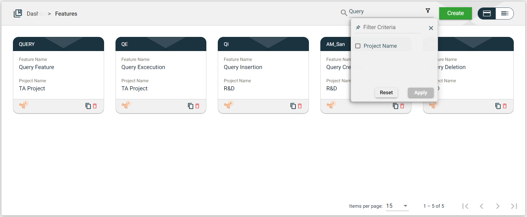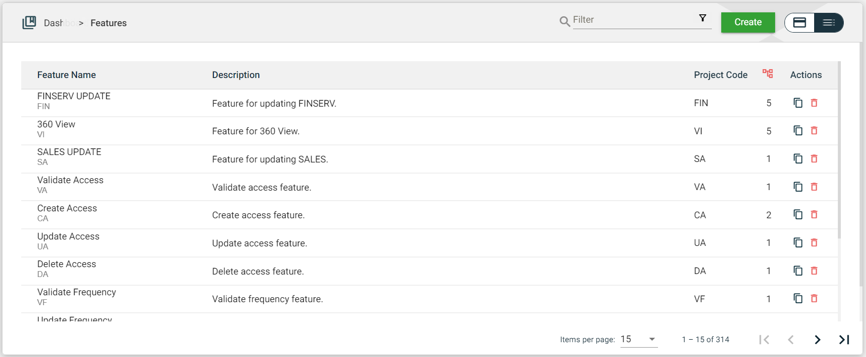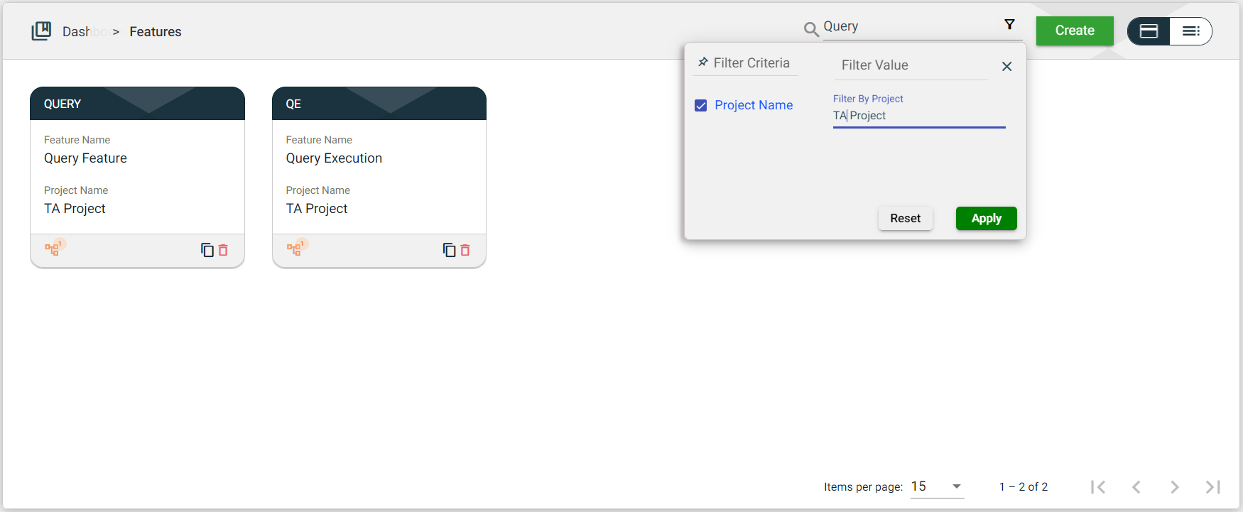 - Filter By Project — allows you to filter the list of features with the configured project by providing a keyword or the full name of the project. Only the features with a configured project that matches the provided keyword or name will be displayed in the view.