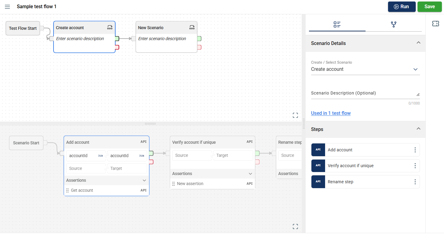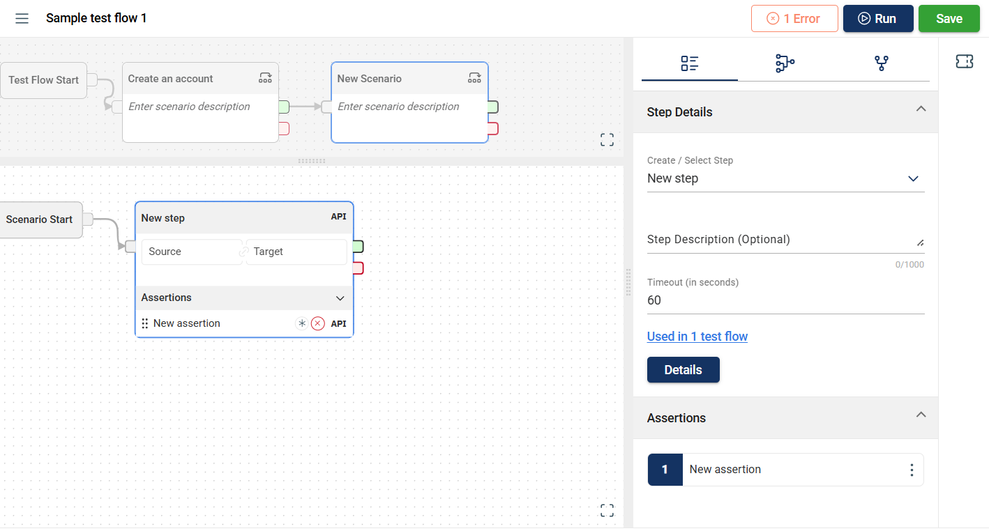 The Flow modules allow you to use the assertions defined in the Assertion module or add a new step to the project within the module.