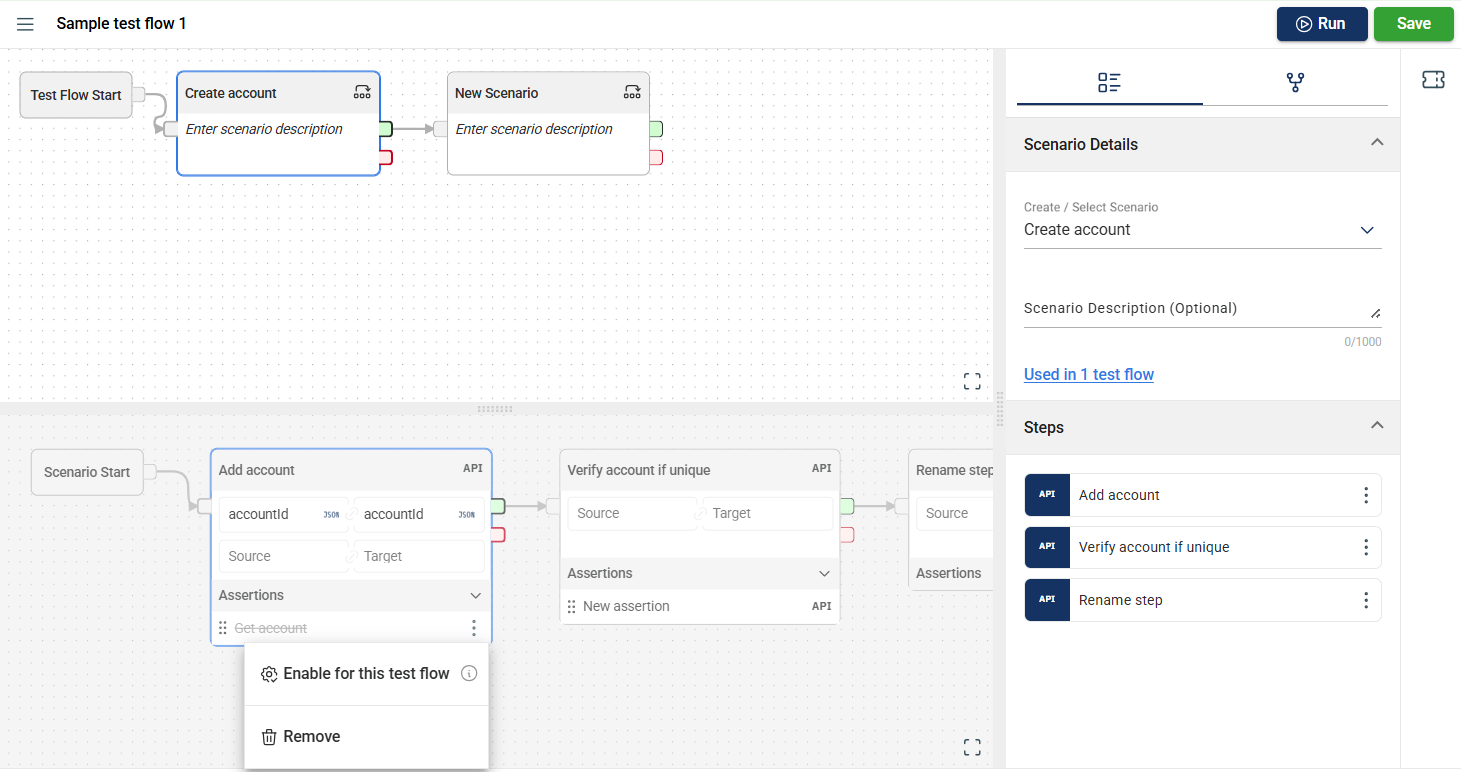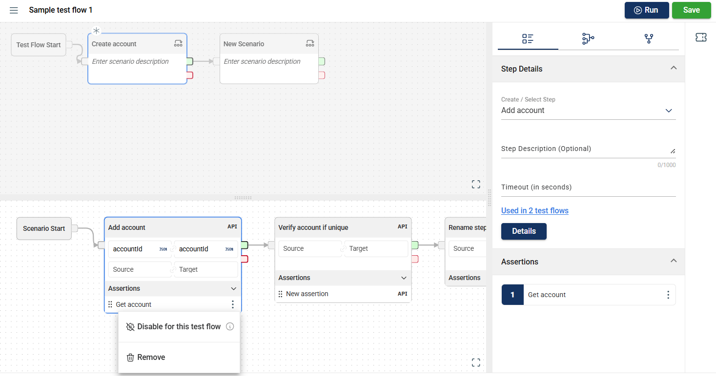 In the Flow module, you can disable an assertion for a specific scenario, preventing it from executing during flow execution.
