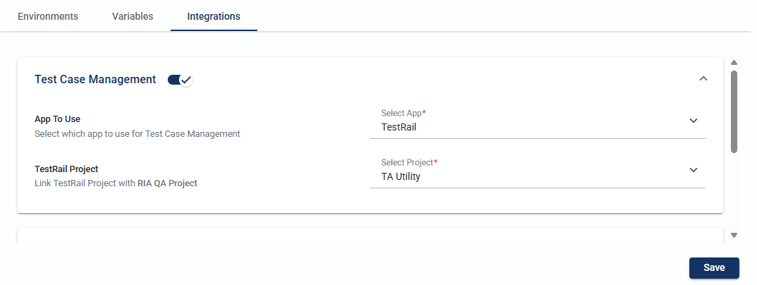 The Integrations section in the Project module enables you to configure integrations at the project level.