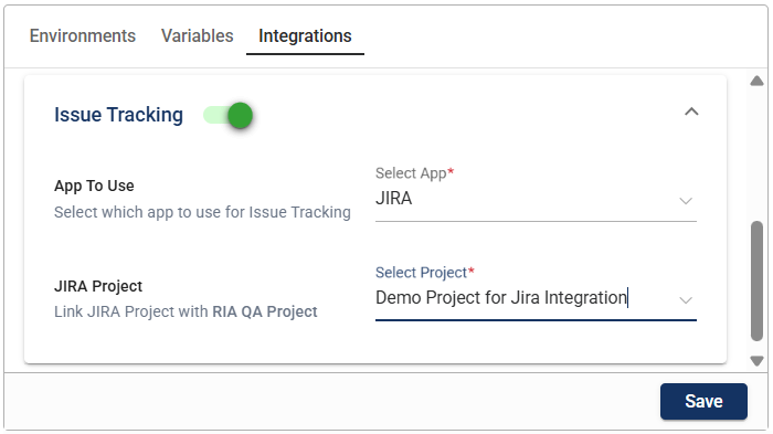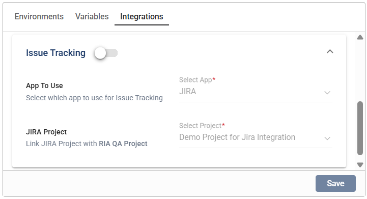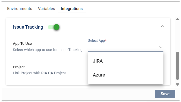 You can modify any configuration for the test case management and issue tracking integrations by selecting a new value from the dropdown list, then clicking the Save button.