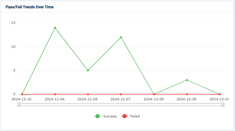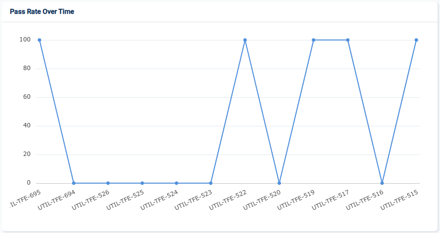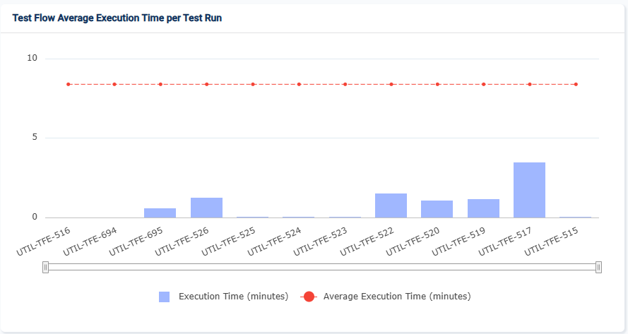 The Test Flow Average Execution Time per Test Run chart provides a quick visual representation of how long the test runs and the average each test run takes to complete.