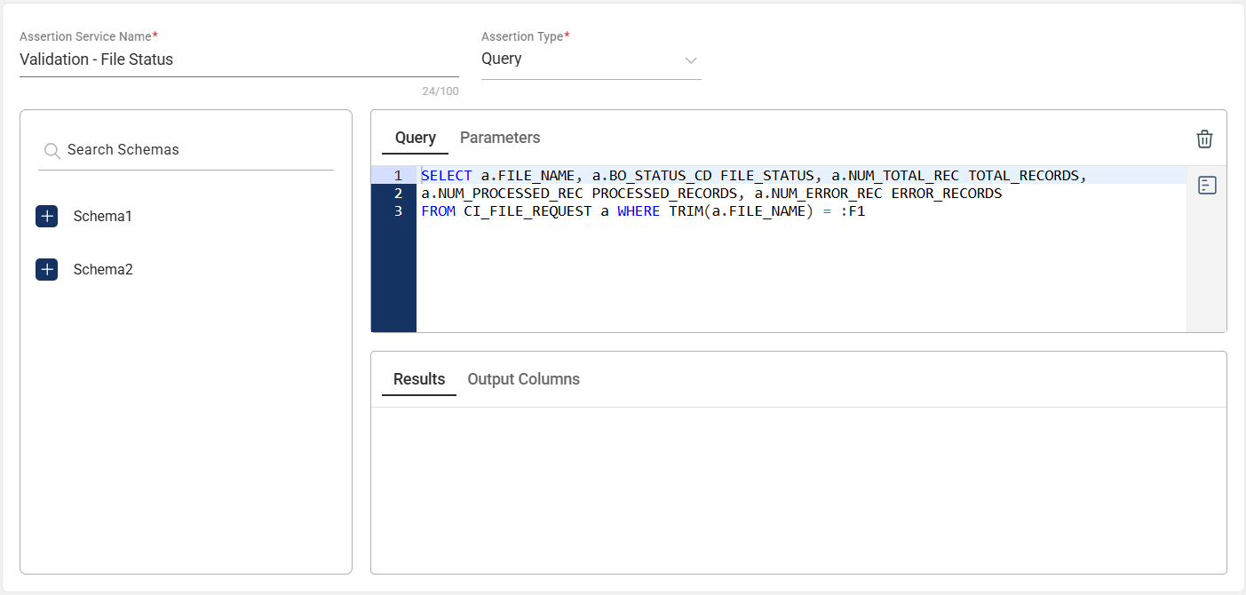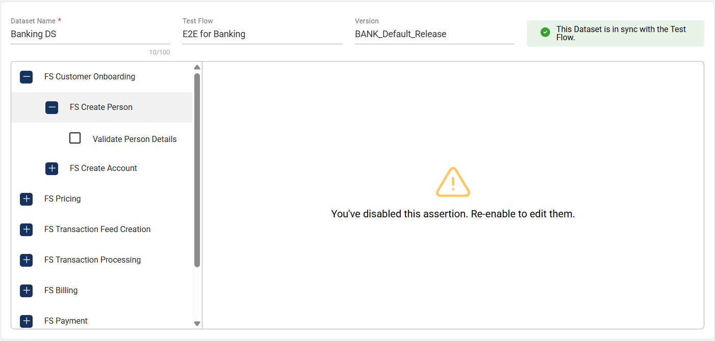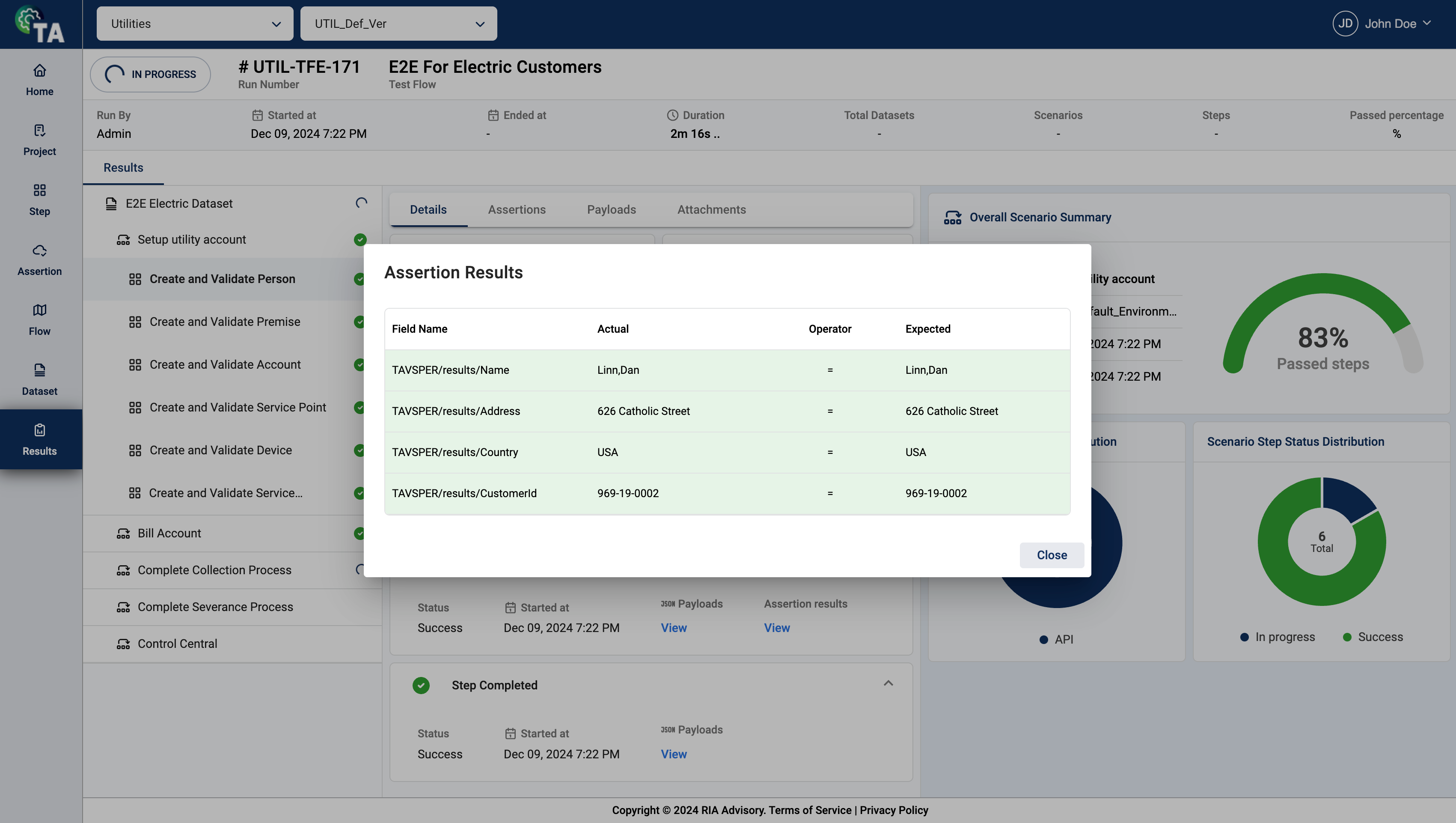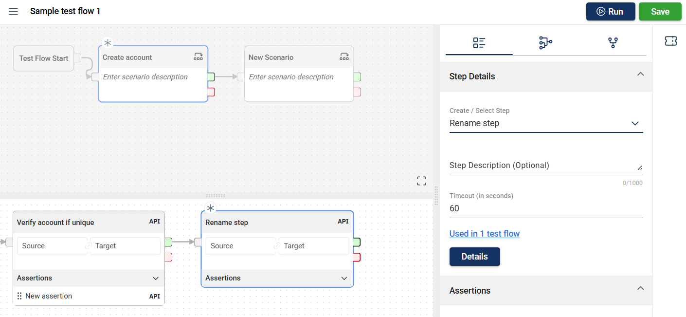 The Assertions tab displays a detailed list of all the field names specified for validation within the selected test step. For each field, the expected value, the actual value, and the operator are displayed in a tabular form.