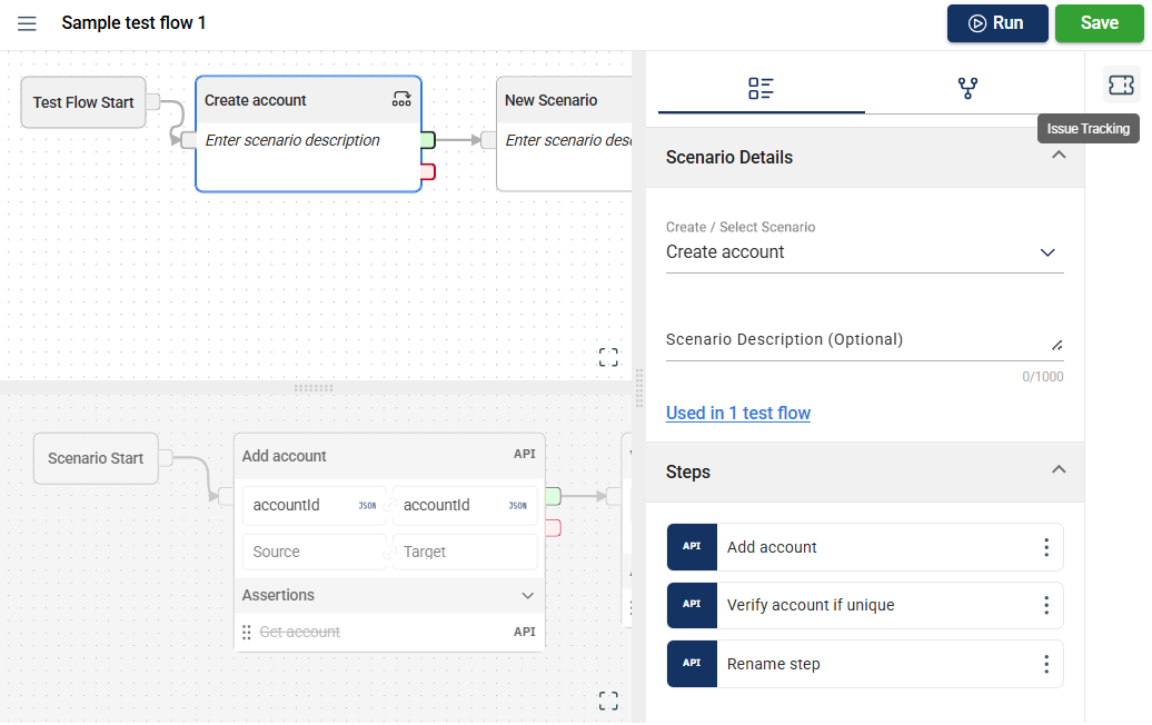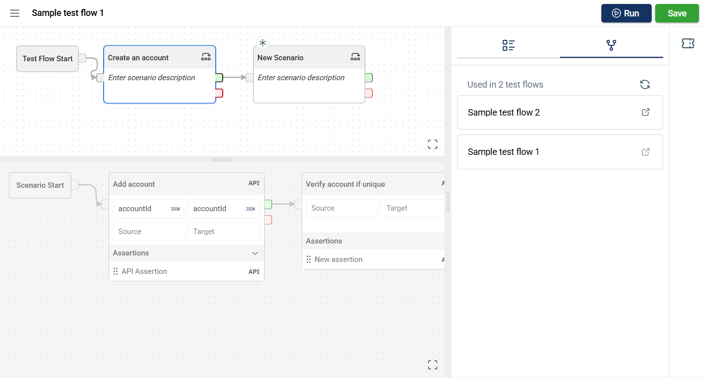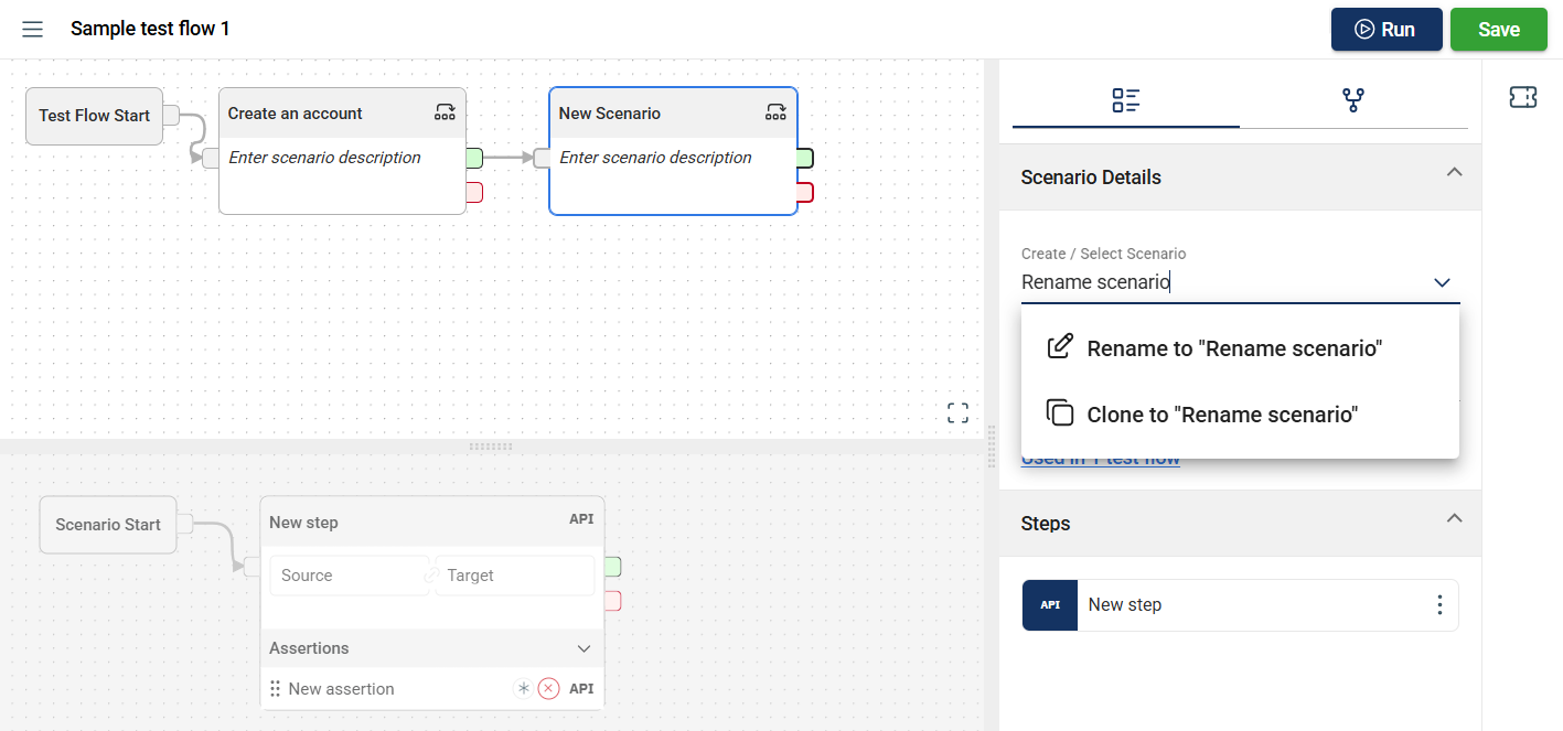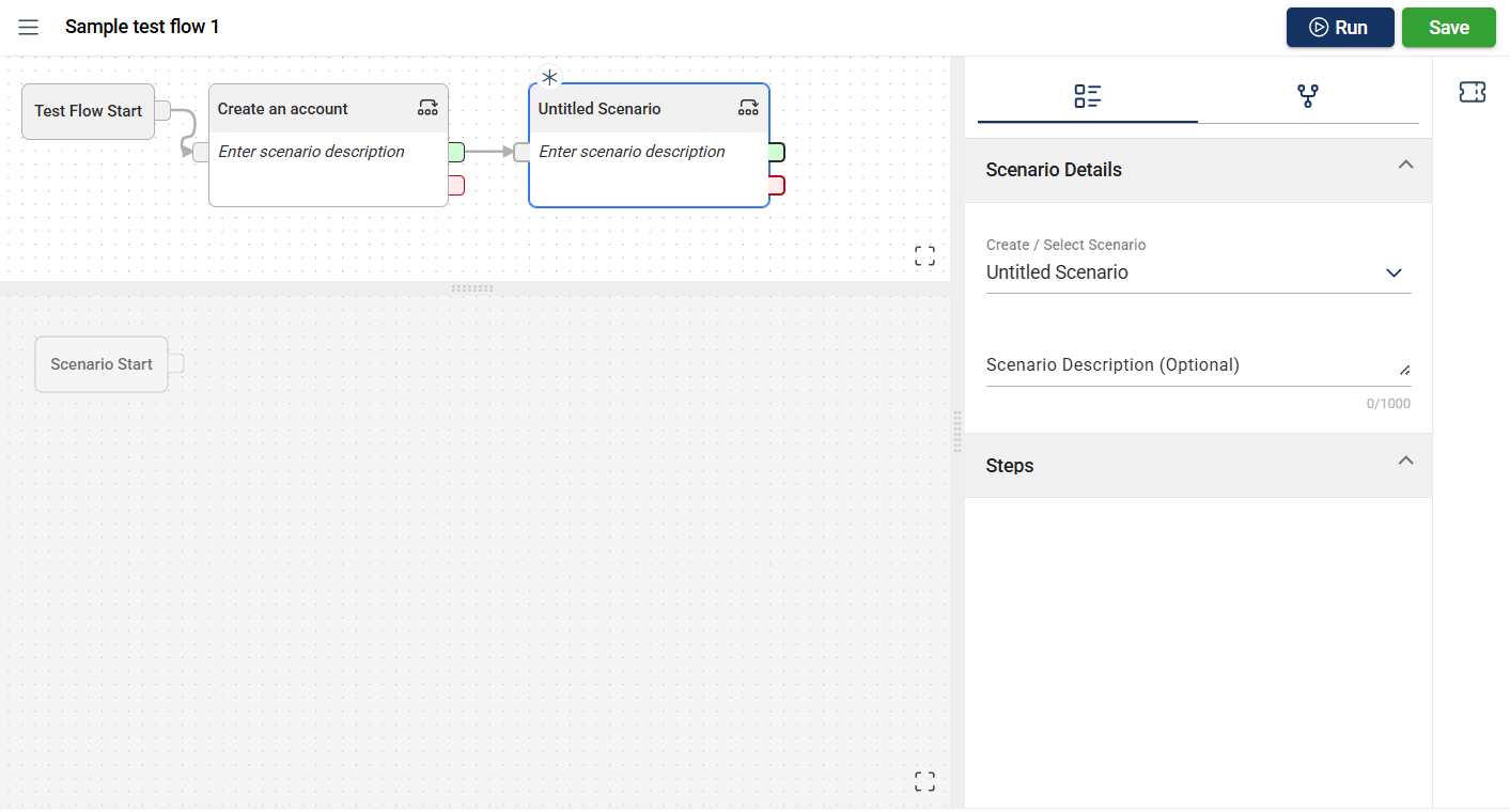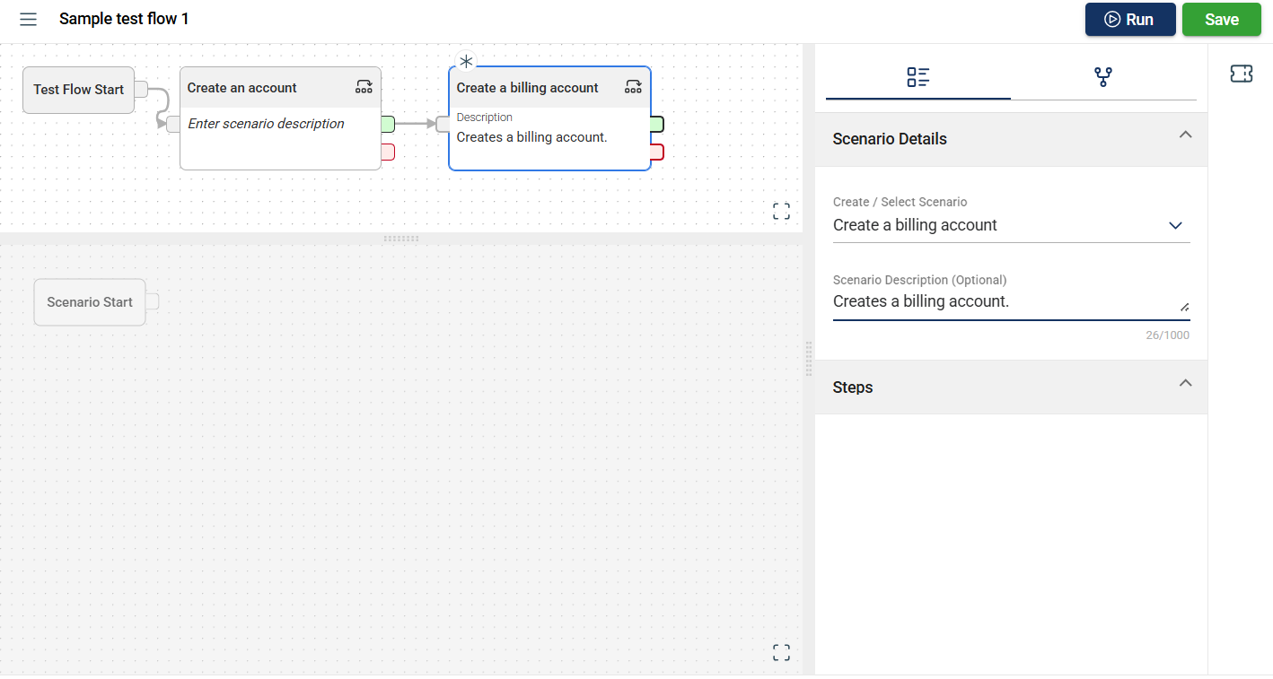 The dashboard highlights the details of the executed test scenarios and their individual steps. The left pane provides a hierarchical view of the test flow, broken down into its constituent scenarios. Each scenario is further expanded to display the steps within it, allowing users to examine the execution status, duration, and other relevant metrics for each step.